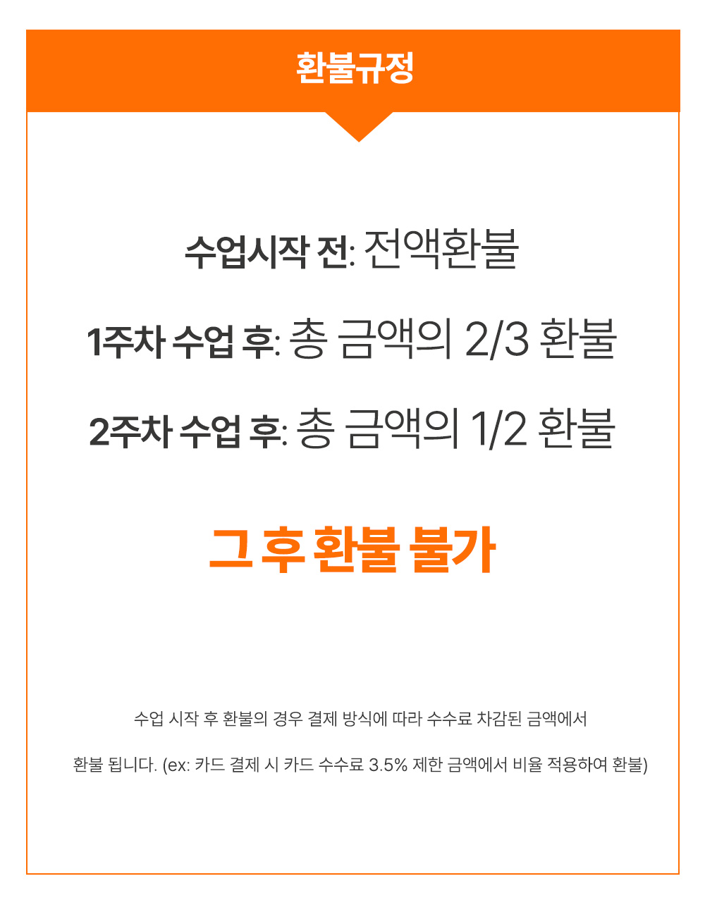 | 수업 시작 후 2주 경과 | 환불 불가 | 총 수업시간의 1/2 경과 후 |